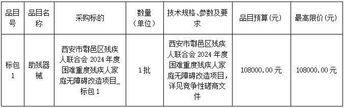 西安市鄠邑區(qū)殘疾人聯(lián)合會2024年度困難重度殘疾人家庭無障礙改造項(xiàng)目,詳見競爭性磋商文件