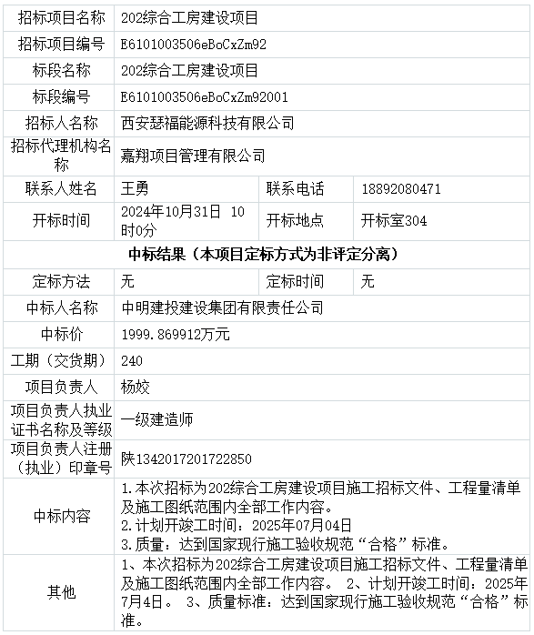 202綜合工房建設項目中標結果公告