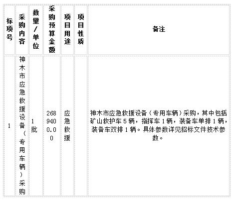 神木市應(yīng)急救援設(shè)備(專用車輛)采購采購項目已于 2019年12月24日進行 公開招標(biāo) ,現(xiàn) 招標(biāo) 工作已結(jié)束,根據(jù) 評標(biāo)委員會 的評審結(jié)論和采購人 “定標(biāo)復(fù)函” ,現(xiàn)將 中標(biāo) 結(jié)果公告如下: