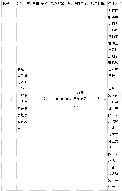 一、采購項(xiàng)目名稱:雁塔區(qū)電子城街道辦事處轄區(qū)地下管廊土方開挖及地表清運(yùn)項(xiàng)目