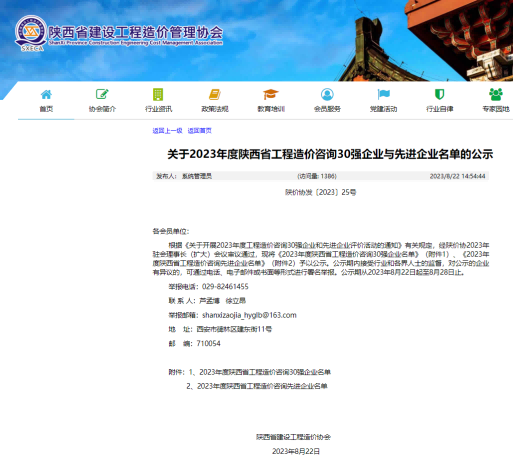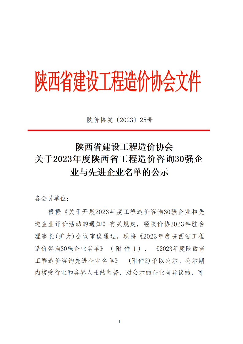 2023年8月22日陜西省建設(shè)工程造價管理協(xié)會發(fā)布了《關(guān)于2023年度陜西省工程造價咨詢30強企業(yè) 與 * 企業(yè)名單》的公示,嘉翔項目管理有限公司位列第31名,榮獲“陜西省工程造價咨詢 * 企業(yè)”的稱號。