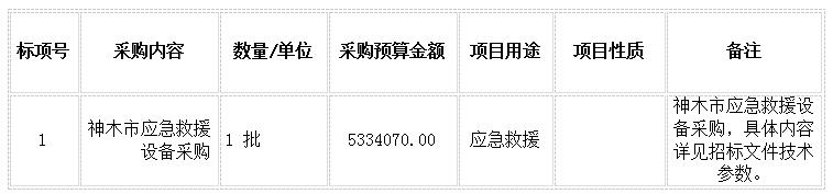 神木市應急救援設備采購采購項目已于 2019年12月24日進行 公開招標 ,現(xiàn) 招標 工作已結(jié)束,根據(jù) 評標委員會 的評審結(jié)論和采購人 “定標復函” ,現(xiàn)將 中標 結(jié)果公告如下: