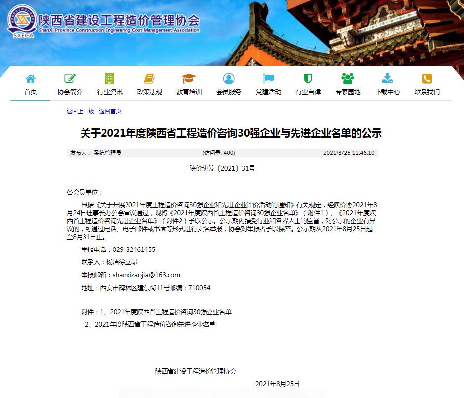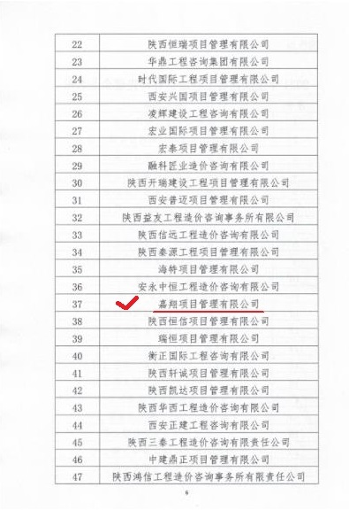 2021年8月25日陜西省建設(shè)工程造價管理協(xié)會發(fā)布了《2021年度工程造價咨詢30強企業(yè)與先進企業(yè)名單》的公示,嘉翔項目管理有限公司位列第37名,榮獲“陜西省工程造價咨詢先進企業(yè)”的稱號。