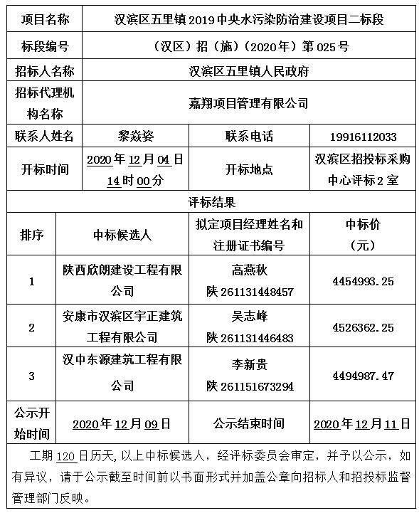 漢濱區(qū)五里鎮(zhèn)2019中央水污染防治建設(shè)項(xiàng)目二標(biāo)段招標(biāo)評(píng)標(biāo)結(jié)果公示